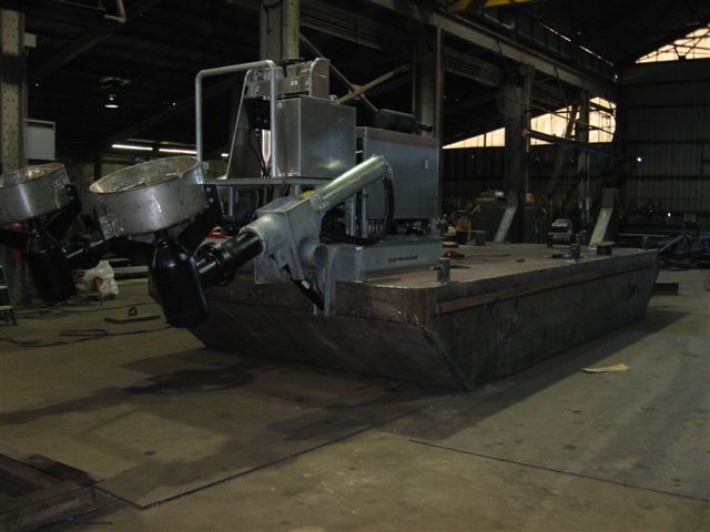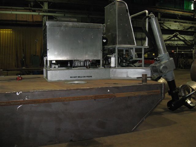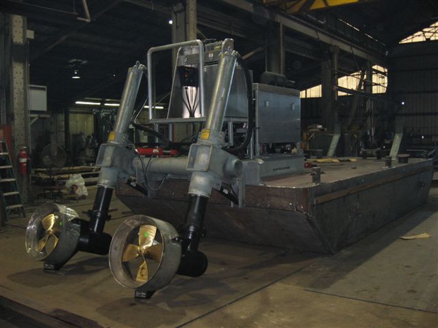 Hydraulic Marine Systems has teamed up with M.D. Moody Fabrication, in Jacksonville, Florida, to produce a Truckable push boat package. This complete package set up is on a 12x25x4' platform, built with 4 water tight compartments(each with their own access hatches), 8' push knees mounted at the front, dual winches and a 225HP Twin Drive Thruster producing 5,000 lbs. of Thrust! These push boat platforms are powerful, very durable and extremely versatile, with tight manuevering and shallow water capabilities!